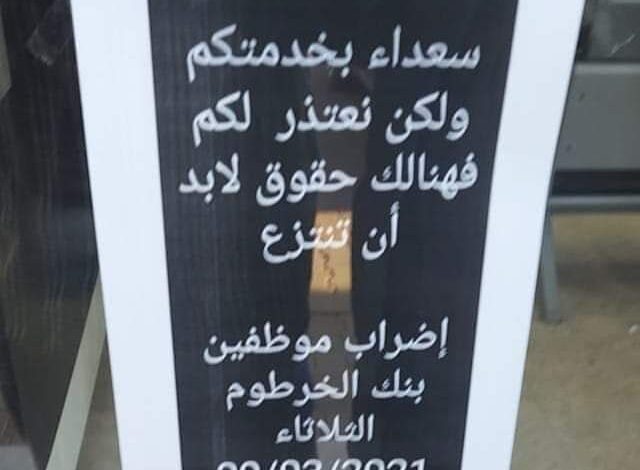 ينفذ موظفي بنك الخرطوم بكافة فروعه بالعاصمة والولايات (اضراب كامل) اليوم الثــــلاثاء لمدة (يوم واحد) للضغط علي ادارة البنــــــــك من أجل تنفيذ مطالب الموظفين والعمال المتمثلة في (زيادة الأجـــــور) (وهيكلة المرتبات) و (وضع سياسات ترقيات شفافة وعادلة) للعاملين بالبنك .
