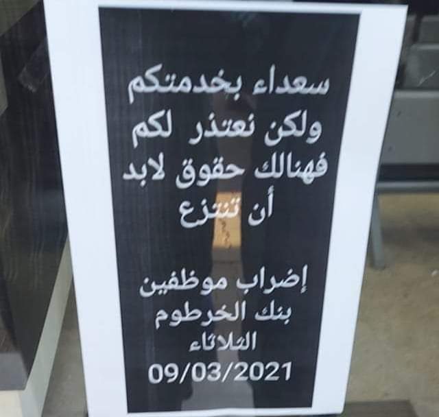 ينفذ موظفي بنك الخرطوم بكافة فروعه بالعاصمة والولايات (اضراب كامل) اليوم الثــــلاثاء لمدة (يوم واحد) للضغط علي ادارة البنــــــــك من أجل تنفيذ مطالب الموظفين والعمال المتمثلة في (زيادة الأجـــــور) (وهيكلة المرتبات) و (وضع سياسات ترقيات شفافة وعادلة) للعاملين بالبنك .