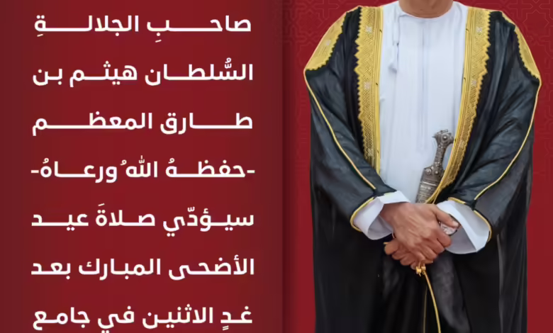 وقالت بان صاحب الجلالة السلطان هيثم بن طارق المعظم حفظه الله ورعاه سيؤدي صلاة عيد الاضحى المبارك غدا الاثنين في جامع معسكر المرتفعة بمحافظة مسقط .