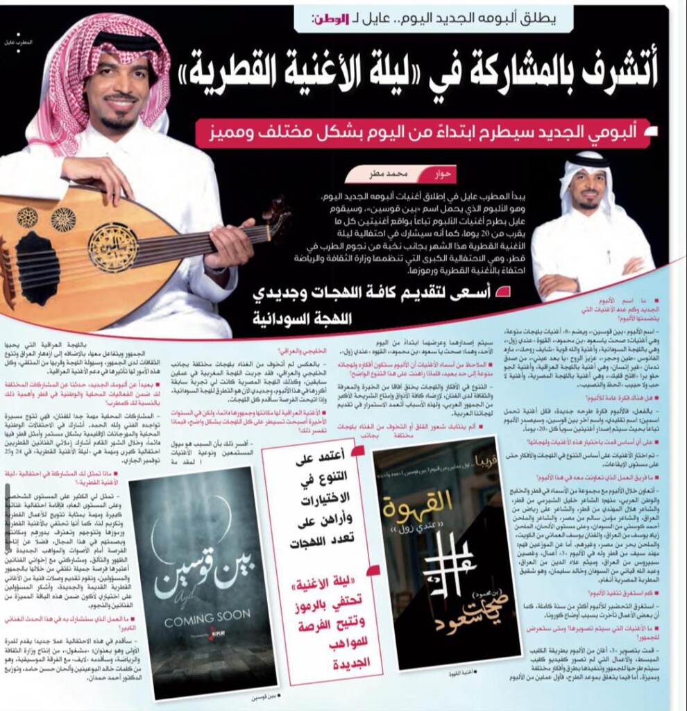 ودشن الفنان “عايل” القطري البوم جديد بعنوان “بين قوسين” استهدف من خلاله عدت لهجات منها اللهجة السودانية وهي اغنية “القهوة” التي صاغ كلماتها الشاعر احمد كوستي .