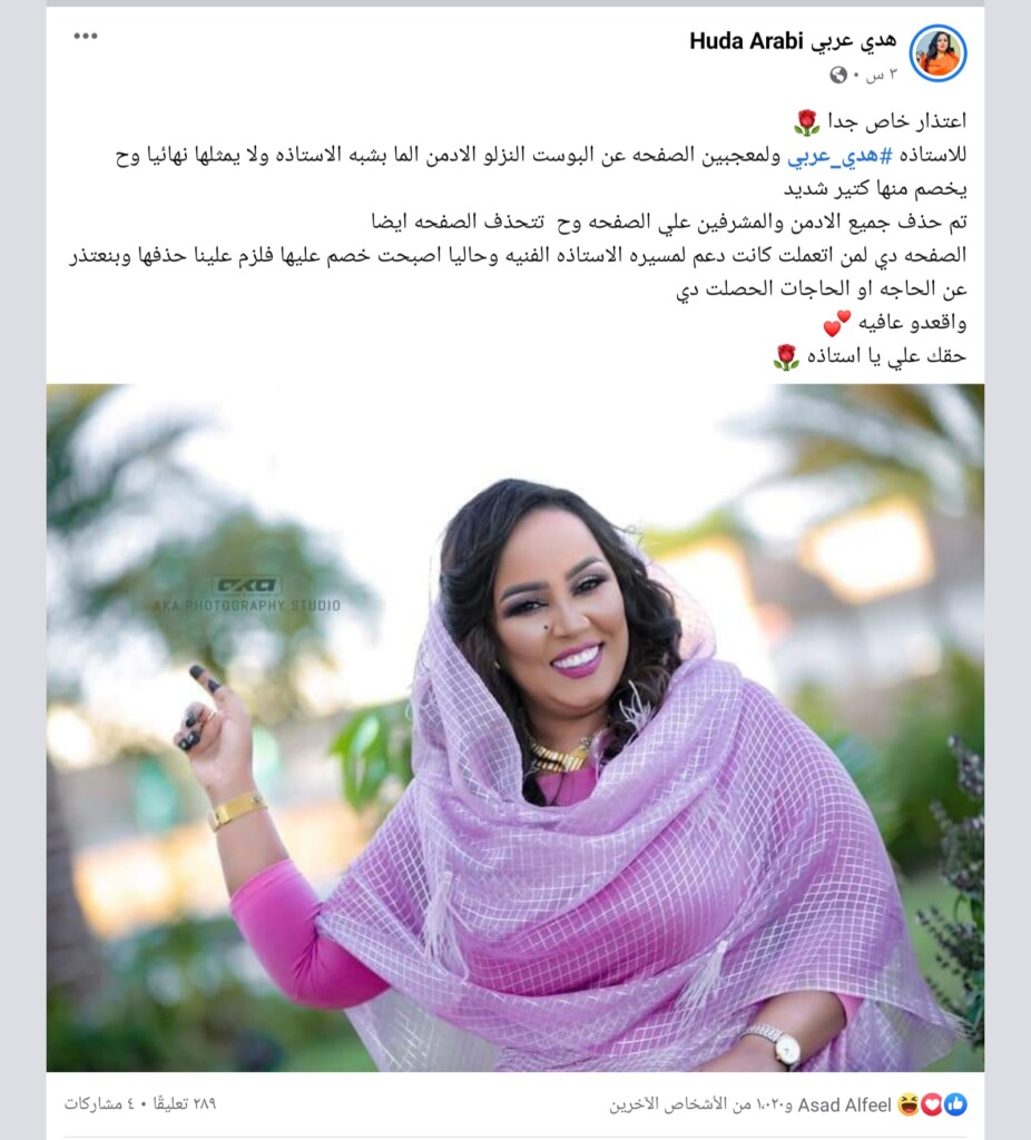وقال ادمن الصفحة بعد اعتذار “هدي” بان الصفحة كانت تقدم اسناد فني لها وبسبب هذا البوست تم حزف جميع المشرفين علي الصفحة ومن المتوقع ان يتم حزف الصفحة بكاملها .